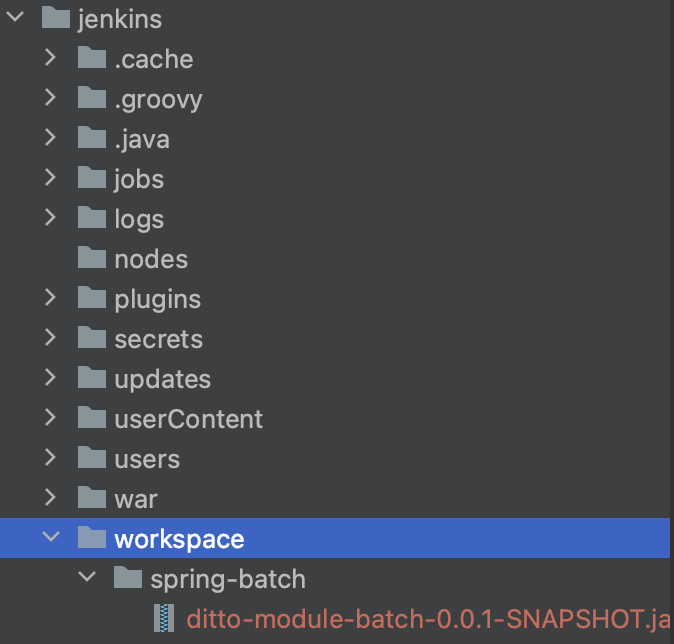 이렇게 workspace > spring-batch 가 생기고 그 안에 빌드해놓은 jar 파일을 넣으면 된다.